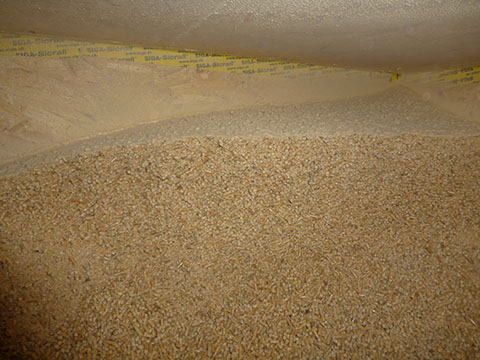 Rohbau eines Pelletlagers mit Pelletkollektor unten in der Mitte zur schonenden energiesparenden Zuführung der Pellets zum Kessel mit einer flexiblen Schnecke