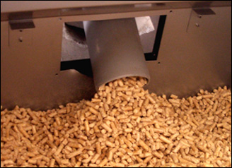 Pelletofen, der aus einem externen Lager automatisch nachgefüllt wird.