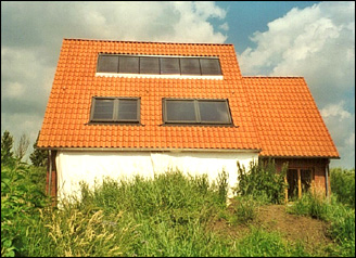 Dieses Bild zeigt einen Sonnenkollektor an einem Passivhaus, der ohne Übergänge direkt in die Gebäudehülle integriert ist.