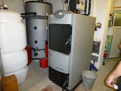 Pelletkessel Pelletec rechts und ein alter Feststoffkessel zur Verbrennung von Stückholz